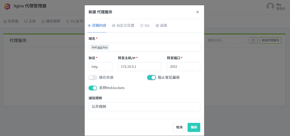 规则写法为域名加本机IP加本机端口,只要不对外开放2052和2053端口,对外只开放NPM反代的端口,别人就无法恶意使用你的CF加速端口,HOST头不对的,都会被NPM拒绝转发,先进入代理服务,添加代理服务,本机NPM的docker的IP为172.19.0.2,所以我们填入网关地址172.19.0.1,也可以填入本机的局域网地址,比如192.168.1.1因为2052和2053都映射到了本机的相同端口.